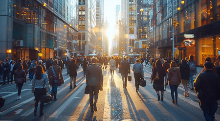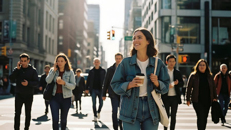 Professionals and pedestrians navigating a busy crosswalk on a vibrant city street, surrounded by a diverse urban crowd