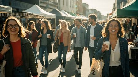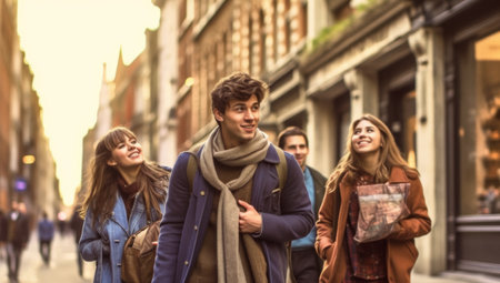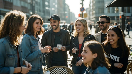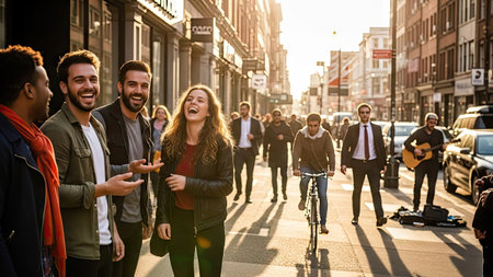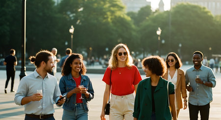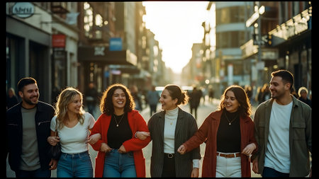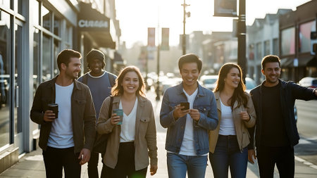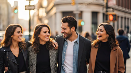 A diverse group of friends strolls down a city street, laughing and enjoying each other's company. The image showcases natural smiles and relaxed body language. The lighting suggests a sunny day, with soft shadows and a warm color palette. This image is suitable for use in lifestyle or editorial content.
