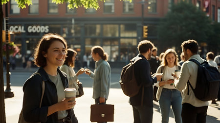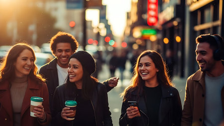 A diverse group of young adults walking side by side on a city street, each holding a coffee cup and smiling, with a blurred urban background and warm sunlight.