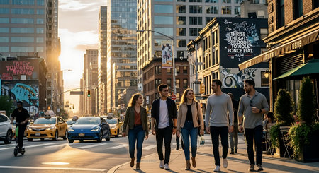 A group of stylish young adults walking down a city street, showcasing modern fashion trends. The scene captures a blend of casual and chic outfits, with a vibrant urban backdrop.