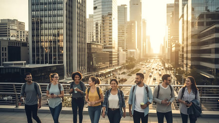 Multicultural business team walking outdoors in urban city area