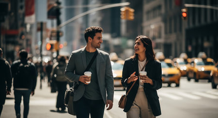 A man and woman, dressed in business casual attire, walk together on a bustling city street, each holding a coffee cup and smiling at each other.