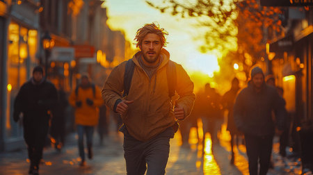A crowd of people walking down a busy city street at sunset, with the warm light casting long shadows