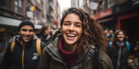 Group of friends walking in the city, looking at camera and smiling