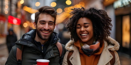 Happy interracial couple enjoying winter walk with hot drinks laughing together. Concept Outdoor Photoshoot, Interracial Couple, Winter Walk, Hot Drinks, Laughter