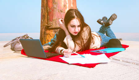 Young serious woman reading contract with pensive facial expression outdoors - Beautifull girl with laptop holding pen looking down at papers lying on rocks by the beach