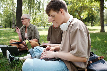 College student sitting on the grass and typing on laptop he sudying in the park together with other people