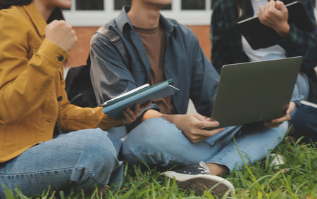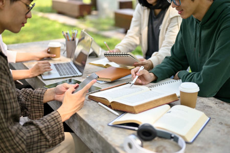 Cropped image, Group of Asian college students preparing for the exam, doing homework or school project together at a campus park. Education concept