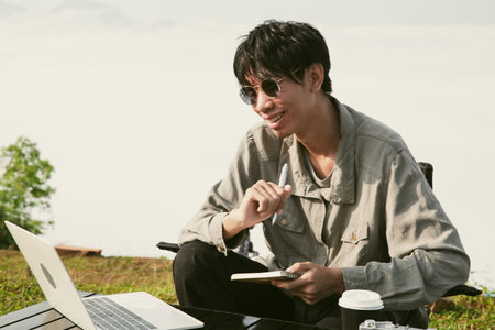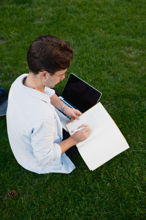 Man Writing in Notebook with Laptop in Scenic Outdoor Setting