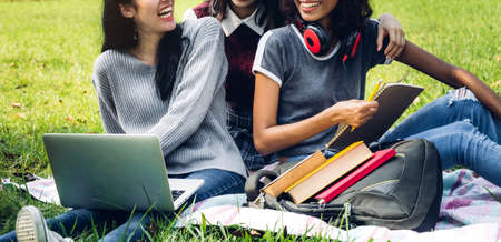 Group of smiling international students or teenagers sitting and using laptop computer doing their homework with book together in park at university.Education and friendship Concept