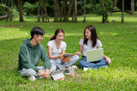 A group of cheerful Asian students in casual clothes sits and talks in the green park, enjoying their conversation while working on their co-project together. friendship and education concepts
