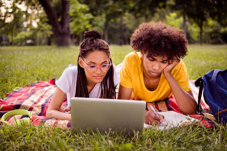 Photo portrait young couple laying on grass preparing for trest in university using laptop