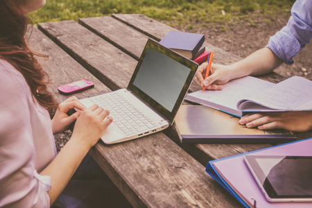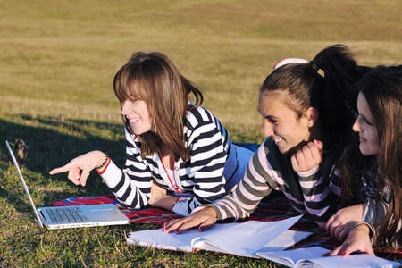 group of teen girl woman outdoor have fun and study homework on laptop computer