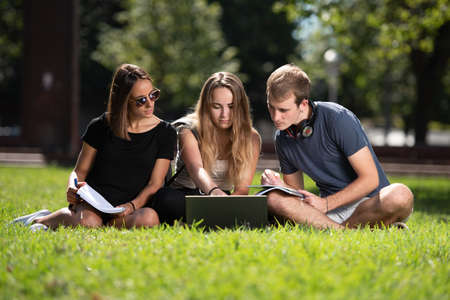 Three college students learning and working together with a laptop while sitting on the ground of a park.