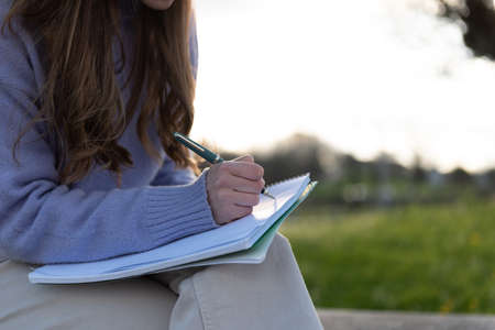 Detail of a woman writing on a notebook with copy space in the sky