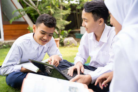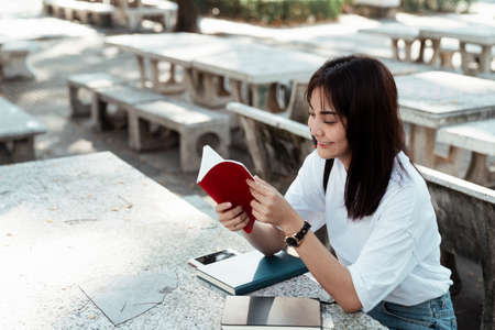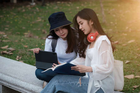 A group of young or teen Asian student in university smiling and reading the book and look at the tablet or laptop computer in summer holiday.