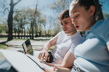 Students studying together on a sunny day in the park, sharing ideas and solutions