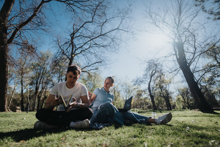 Young friends studying together in a park and exchanging ideas outdoors