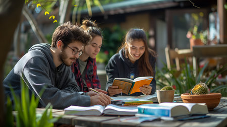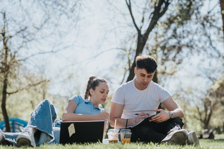 College students studying together at a sunny park, sharing ideas and enjoying nature