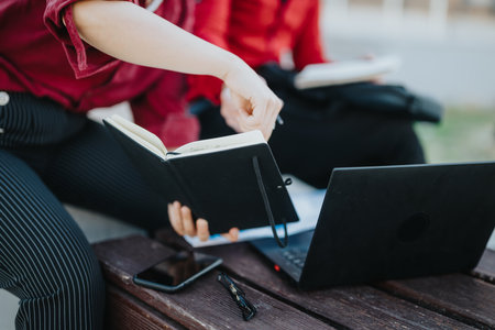 Business meeting in the city with open notebooks and laptop on a wooden bench