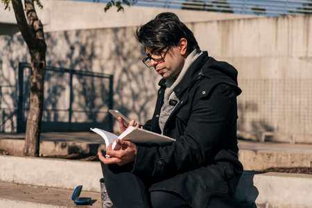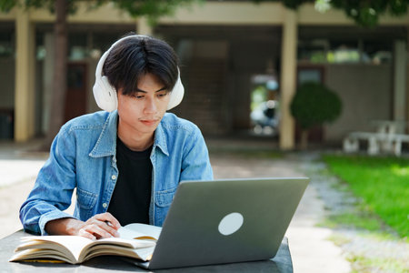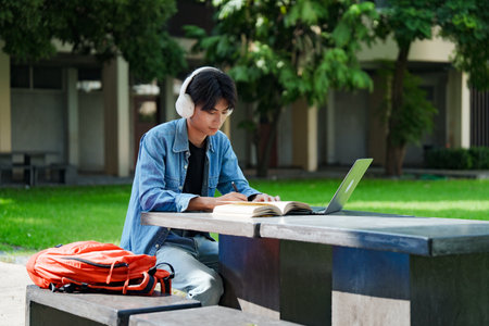A happy and handsome young Asian male college student is doing his homework or preparing for the exam in a campus park. Education concept
