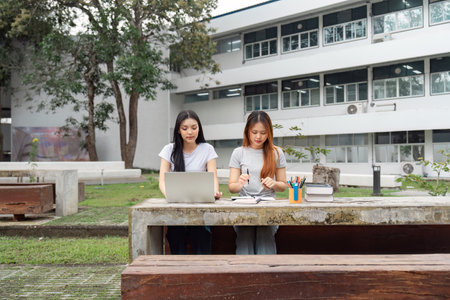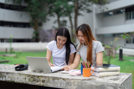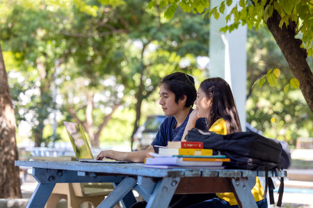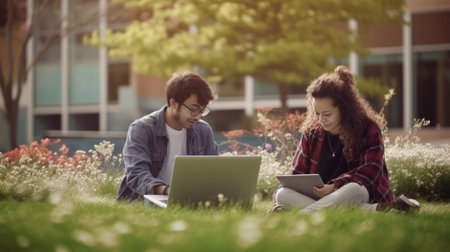 Generative AI : Asian couple student college friends sitting and holding computer laptop in the green park at campus university