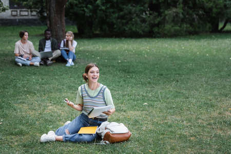 Cheerful student with smartphone and notebook sitting on lawn near blurred interracial friends