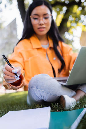 blurred asian woman sitting on lawn with laptop and pen near notebooks