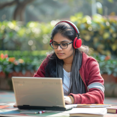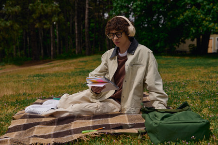 a student studying outdoors, surrounded by nature, with a laptop and books on a blanket