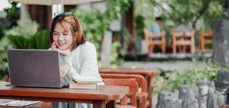 Young asian woman in casual clothing holding note book and working on laptop computer while sitting in outdoor cafe, Concept working with new normal
