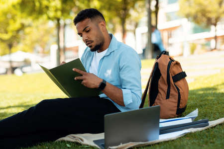 Focused black male student learning, using laptop and taking notes, sitting in park outdoors. Online education concept