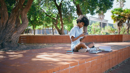 Cute teenager reading smartphone message sitting street in tree shadow. Teen african american girl looking cellphone screen resting in urban area alone. Curly black-hair student scrolling mobile phone