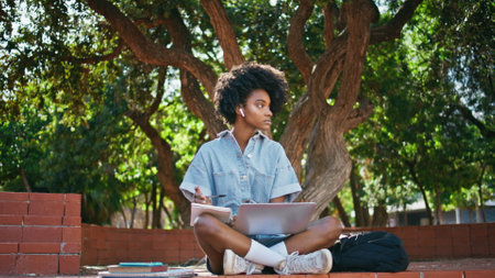 Teenager studying in remote class using laptop sitting beautiful green park. Stylish african american girl doing homework in copybook. Black-haired college student making notes in notebook at street.
