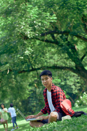 Asian man student reading book on green lawn at university campus. Youth lifestyle, university and friendship concept.
