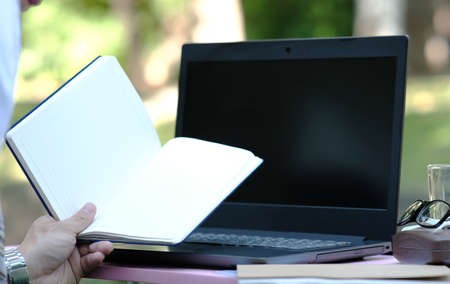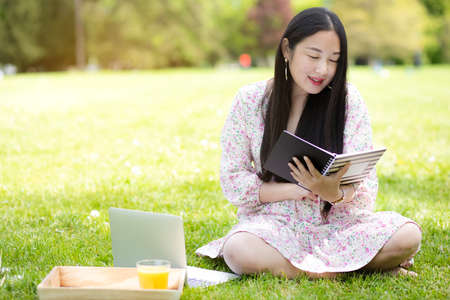 Working outside in summer or spring and WFH concept, Young beautiful Asian woman reading a book and looking laptop in the natural park, Freelance working, homeschooling, distance learning.