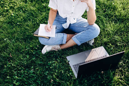 student girl with laptop outdoors sitting on the grass, surfing the internet or preparing for exams. Technology, education and remote work concept. Soft selective focus.