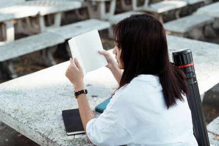 Cute girl in white t-shirt read red book at the marble table and smile.
