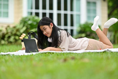 Portrait with Asian girl lying on picnic mat on the lawn and playing with tablet.