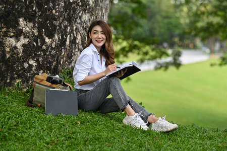 Photo of a beautiful woman taking notes and smiling while sitting on the grass over an urban park tree as a background.