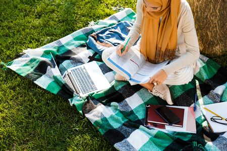 Photo from above of young arabic female student wearing headscarf sitting on blanket in green park and studying with laptop and books