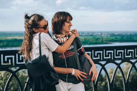 Generative AI : Two friends are taking a photograph outdoor