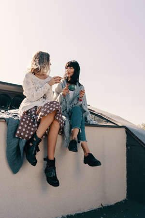 Young woman sitting on wooden chair near van and drinking tea outdoors in nature, during sunset. Enjoying summer, travel concept