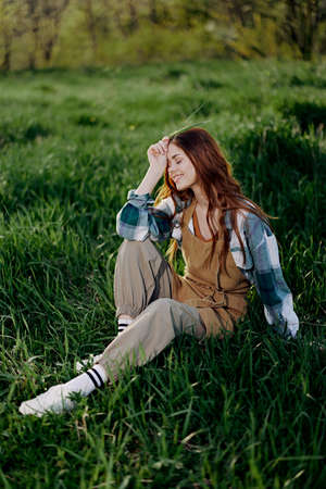 A young, beautiful woman lounges on the green grass in the park wearing sneaker pants and a plaid shirt and looks out into the setting sun