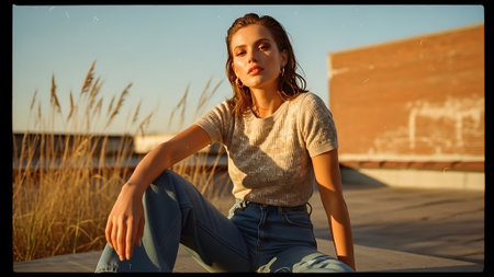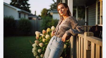 A young woman in a cozy sweater poses on a porch with flowers in the background during golden hour