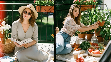 collage of beautiful young women in hats and sunglasses reading book while sitting on terrace