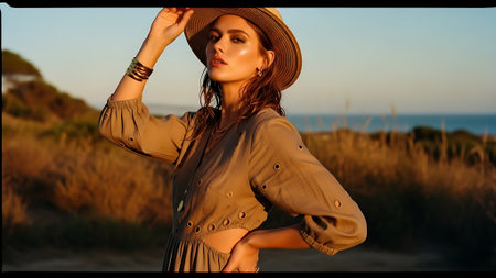 Beautiful young woman in a hat on the beach at sunset.