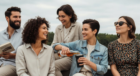 Group of friends having a picnic in the park and drinking beer.