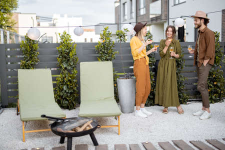Young friends spending summertime together, standing with drinks and snacks on a backyard of the country house and having fun