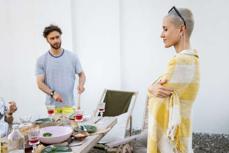 Stylish people having a festive dinner on the roof terrace. Friends hanging out and having great summertime together outdoors