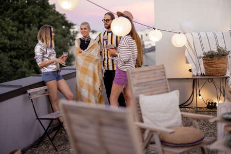 Young stylish friends hang out together, talk and having fun on a rooftop terrace with beautiful view on the city at dusk
